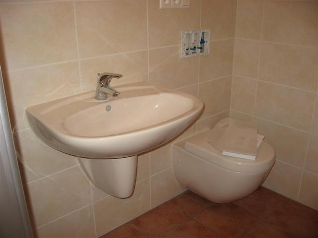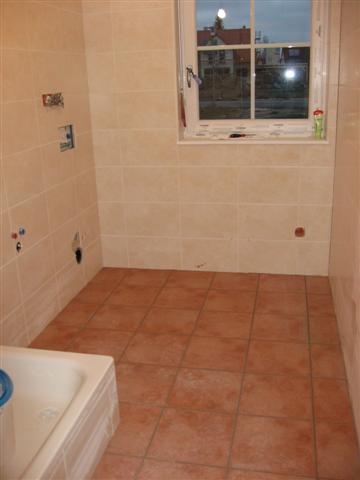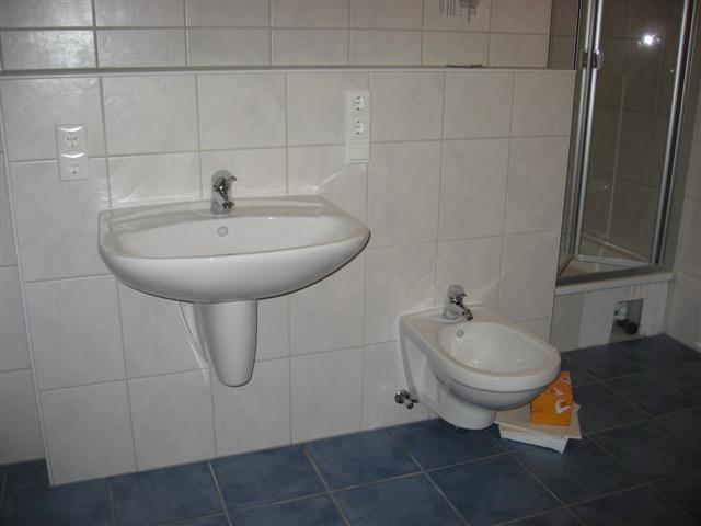 Mittlerweile sind alle 3 Bäder komplett gefliest und verfugt und die Keramiken sind auch dort, wo sie hingehören. Hier das Bad im Erdgeschoß!