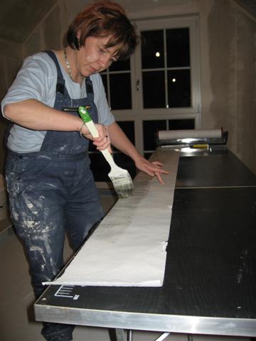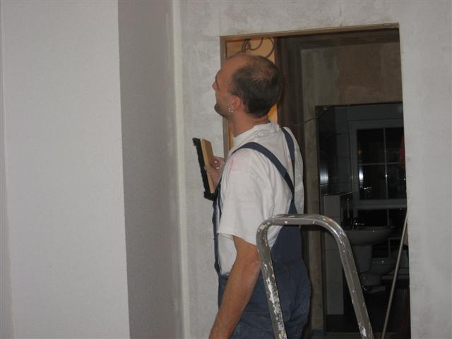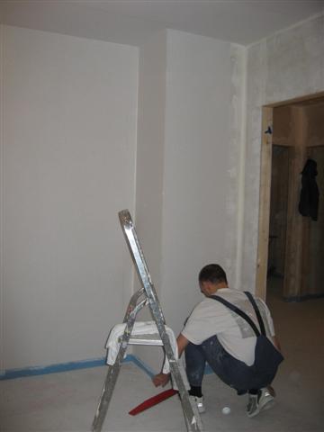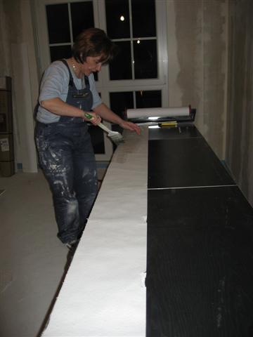 Hier kleister ich nur ein wenig, aber ich hab auch schon die Wände verspachtelt und ein wenig grundiert. Meistens bin ich aber nur für die Verpflegung und für die Kinder zuständig ;-)- auch wenn ich lieber mit anpacken würde.