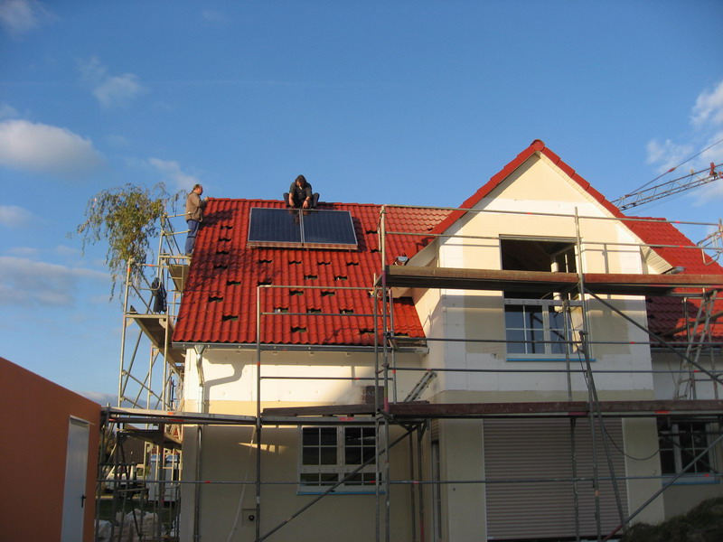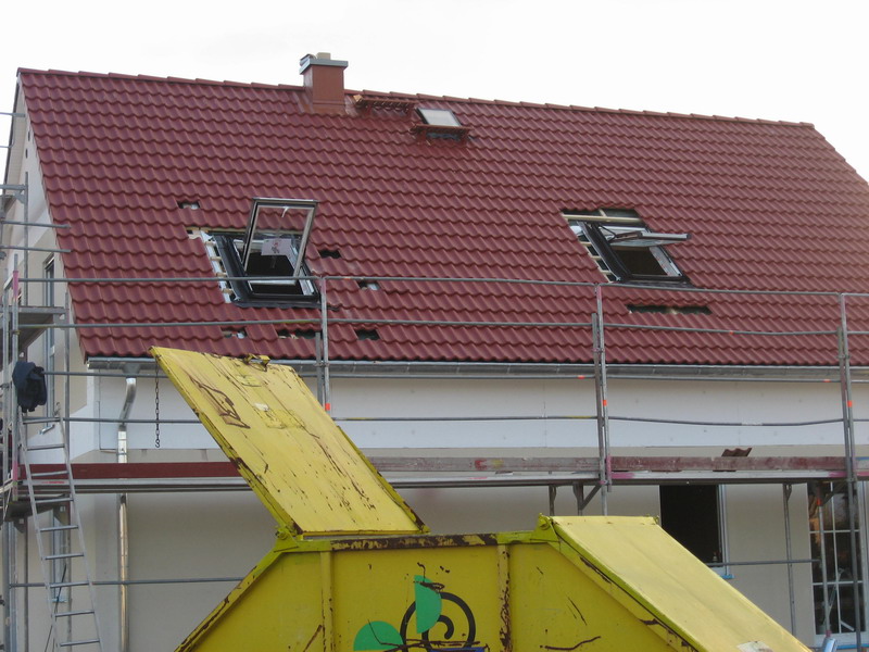 Die Solarpannels sind heute auch aufs Dach gekommen, die Regenrinne und die Regenfallrohre sind montiert, die Dachflächenfenster auf der Nordseite sind drin.